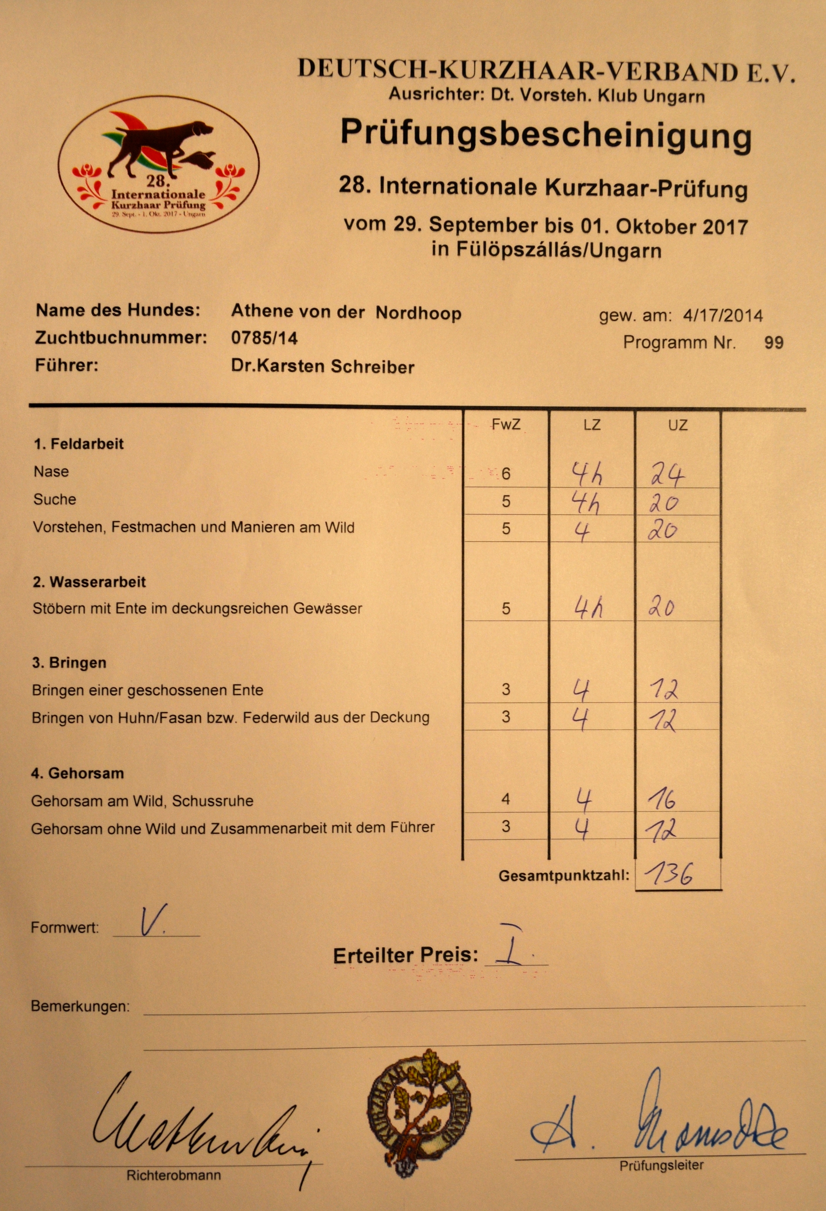 IKP 2017 Ungarn: 1P 136P (Suche 4h, Nase 4h, Wasser 4h) Suchensieger Video, Teilnehmer der Stichsuche CACIT RES. Video